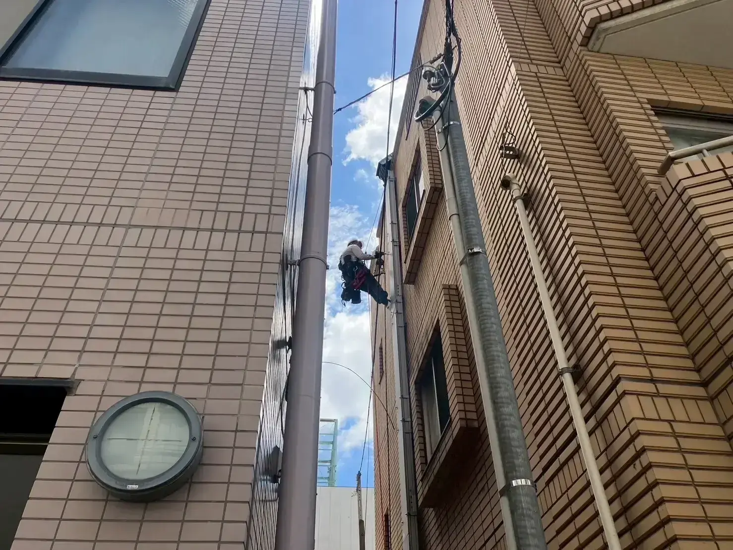 ロープ高所作業とは、建物に専用ロープと器具を設置し、作業員が吊り下がりながら行う高所作業手法です。足場や高所作業車を必要としないため、コストを抑えながら迅速かつ柔軟な施工が可能です。ビルの屋上、マンションの吹き抜け、設備の裏側など——通常の手法では対応できない「難所」で、その真価を発揮します。